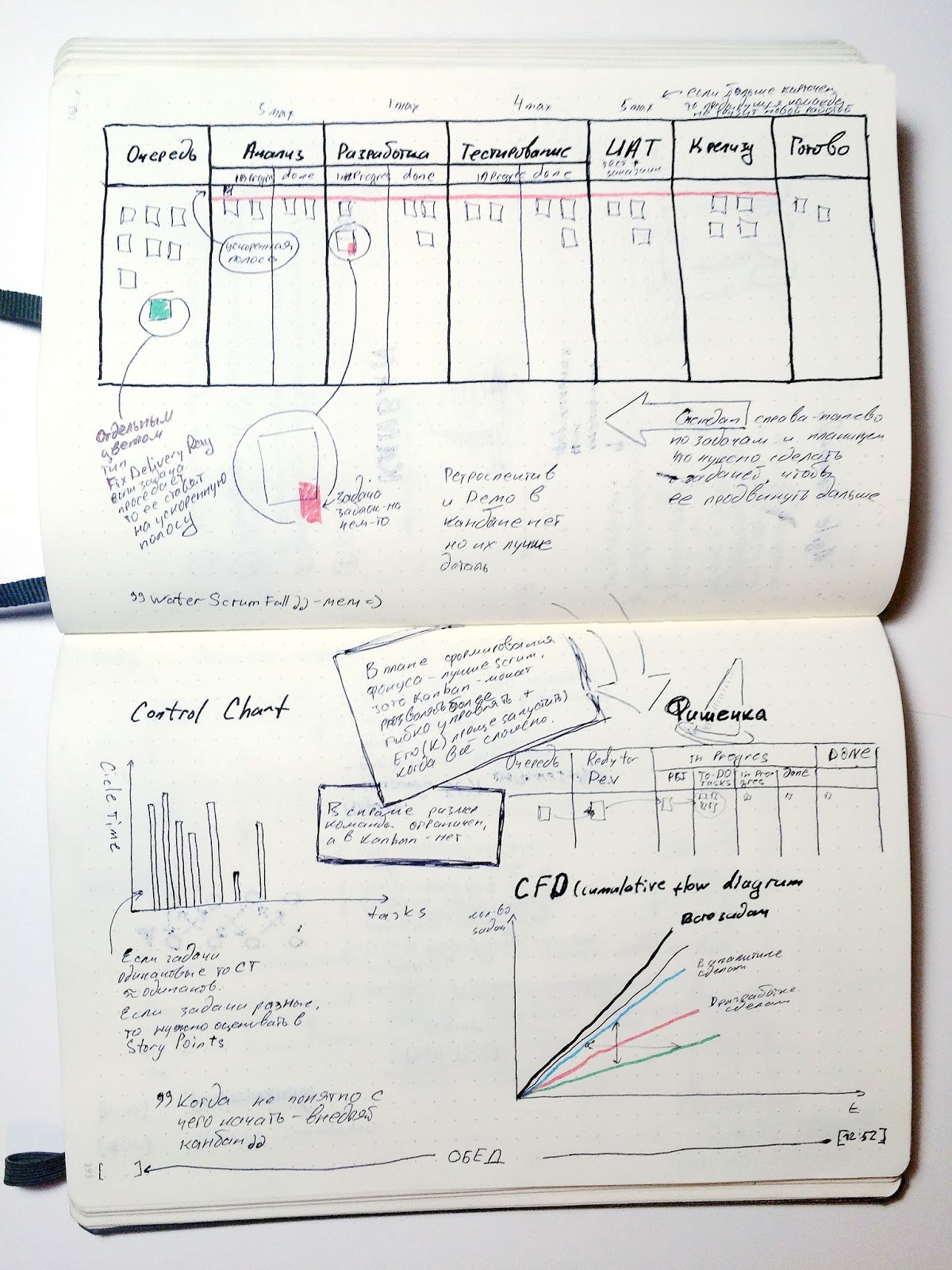 Может показаться, что в этом подходе нет никакого планирования, но это не так. Для учета работ строят CFD (Cumulative Flow Diagram), не буду описывать все тонкости, скажу лишь, что изначально задачи оцениваются все в тех же Story Points или просто разбиваются на равноценные по трудоемкости. Фиксируется время перехода каждой задачи и время нахождения в очереди.